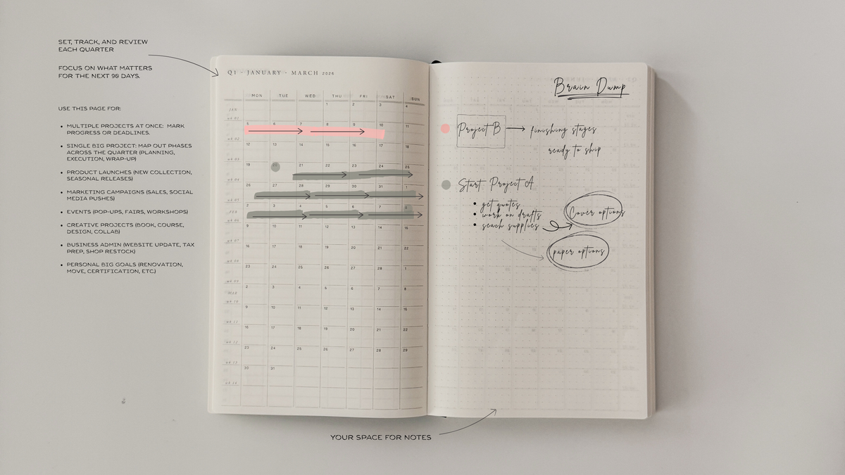 • Quarterly Pages: 8 pages (3 horizontal months per pages + notespages)
