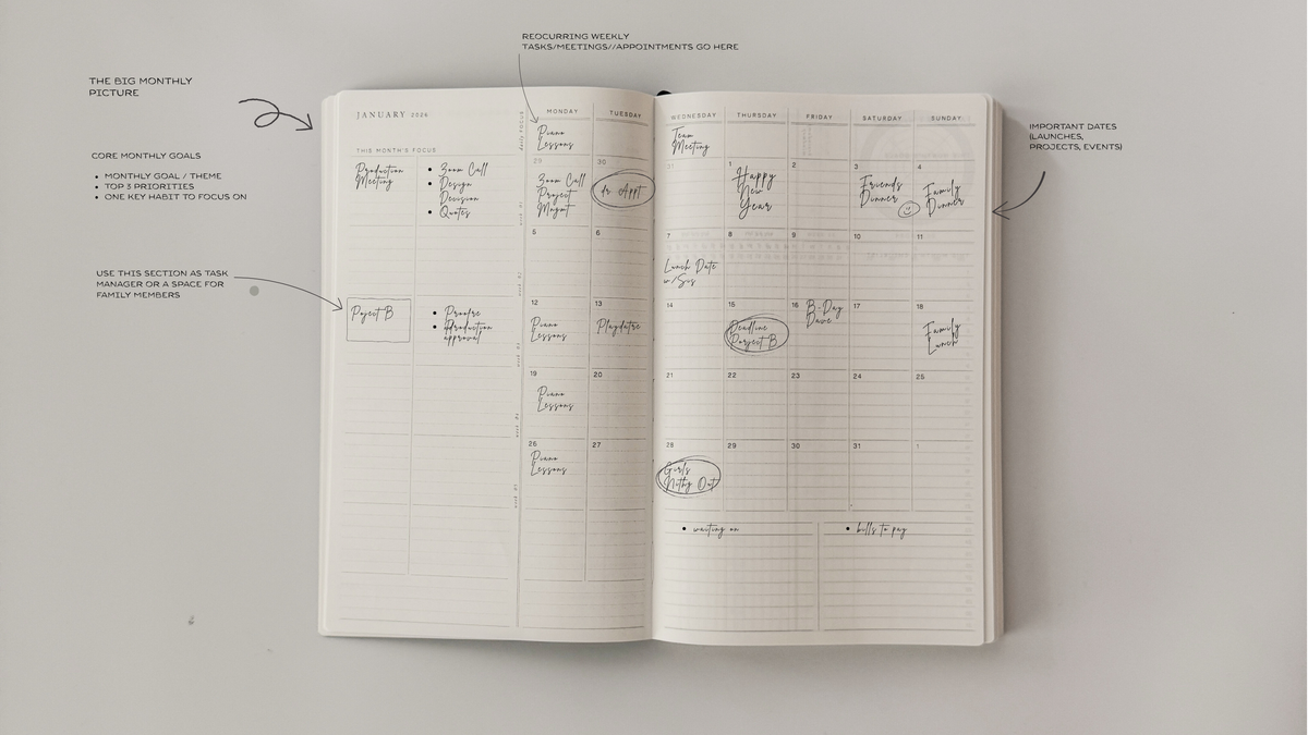 • 4 x Week on 2 pages / each week is followed by a blank dot grid spread (some months have 5 x weeks on 2 pages)